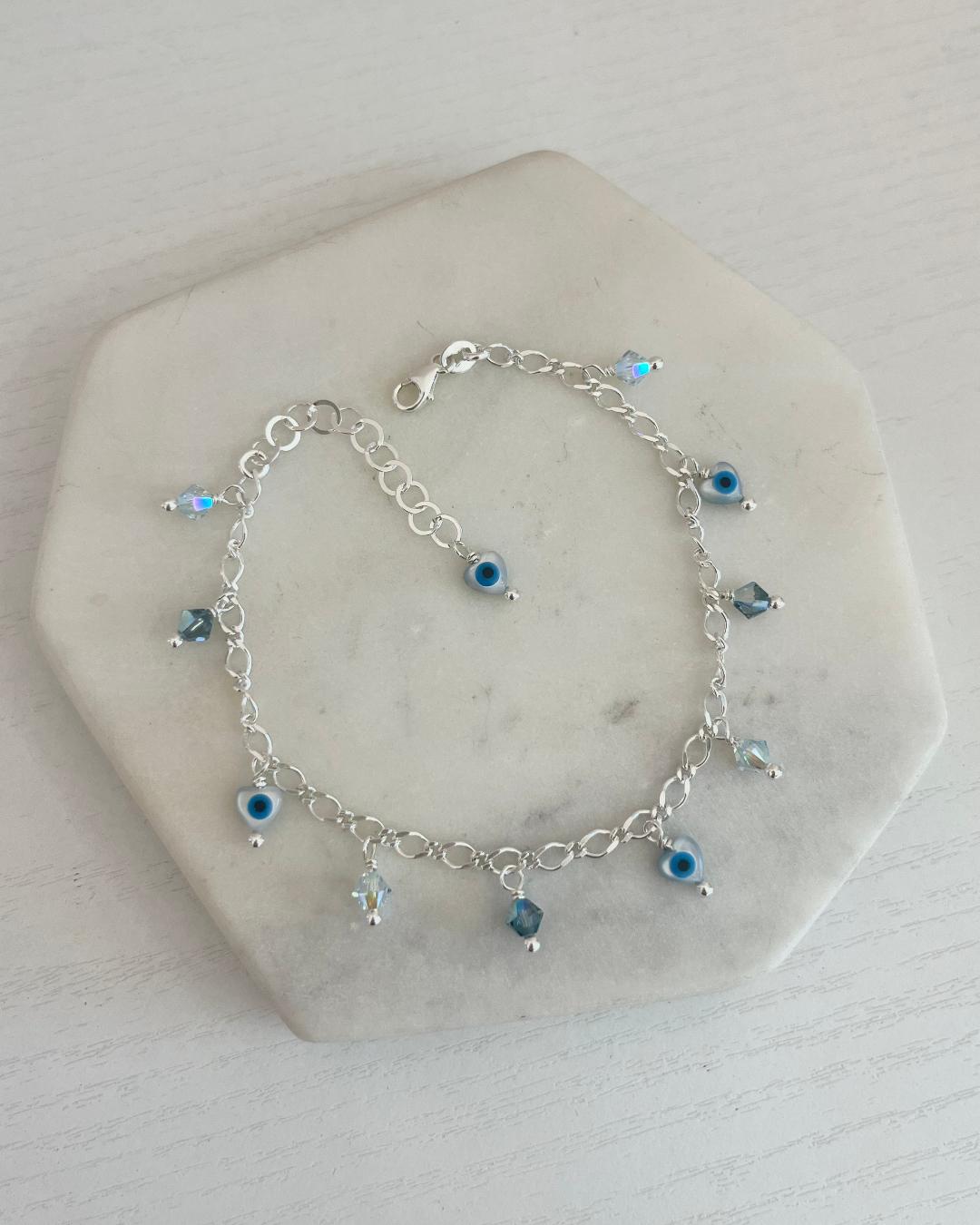 Ένα βραχιόλι με charms από κρύσταλλα & ματάκια φίλντισι σε σχήμα καρδιάς.