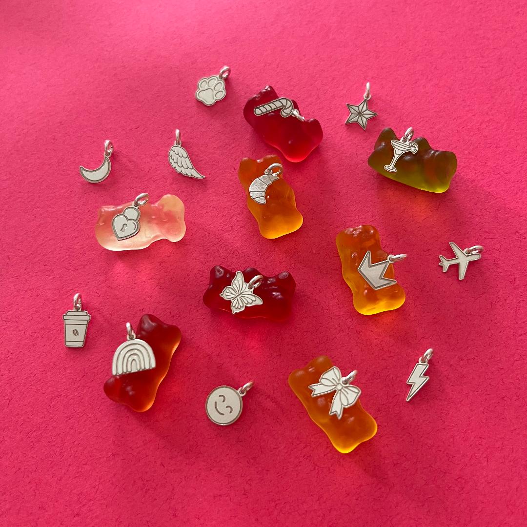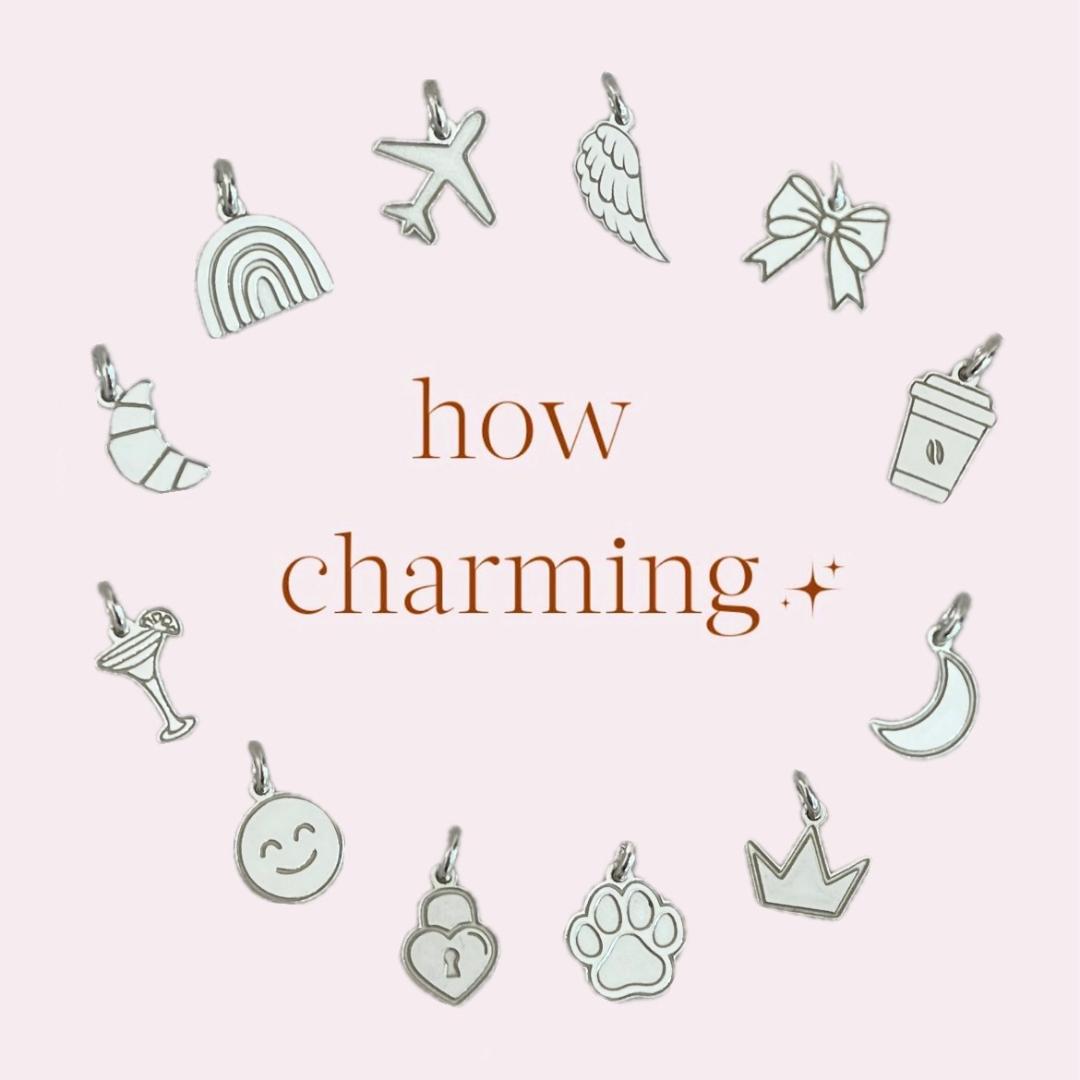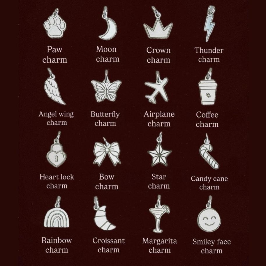 | Charm | Paw, Moon, Crown, Thunder, Angel wing, Butterfly, Airplane, Coffee, Heart lock, Bow, Star, Candy cane, Rainbow, Croissant, Margarita, Smiley face |