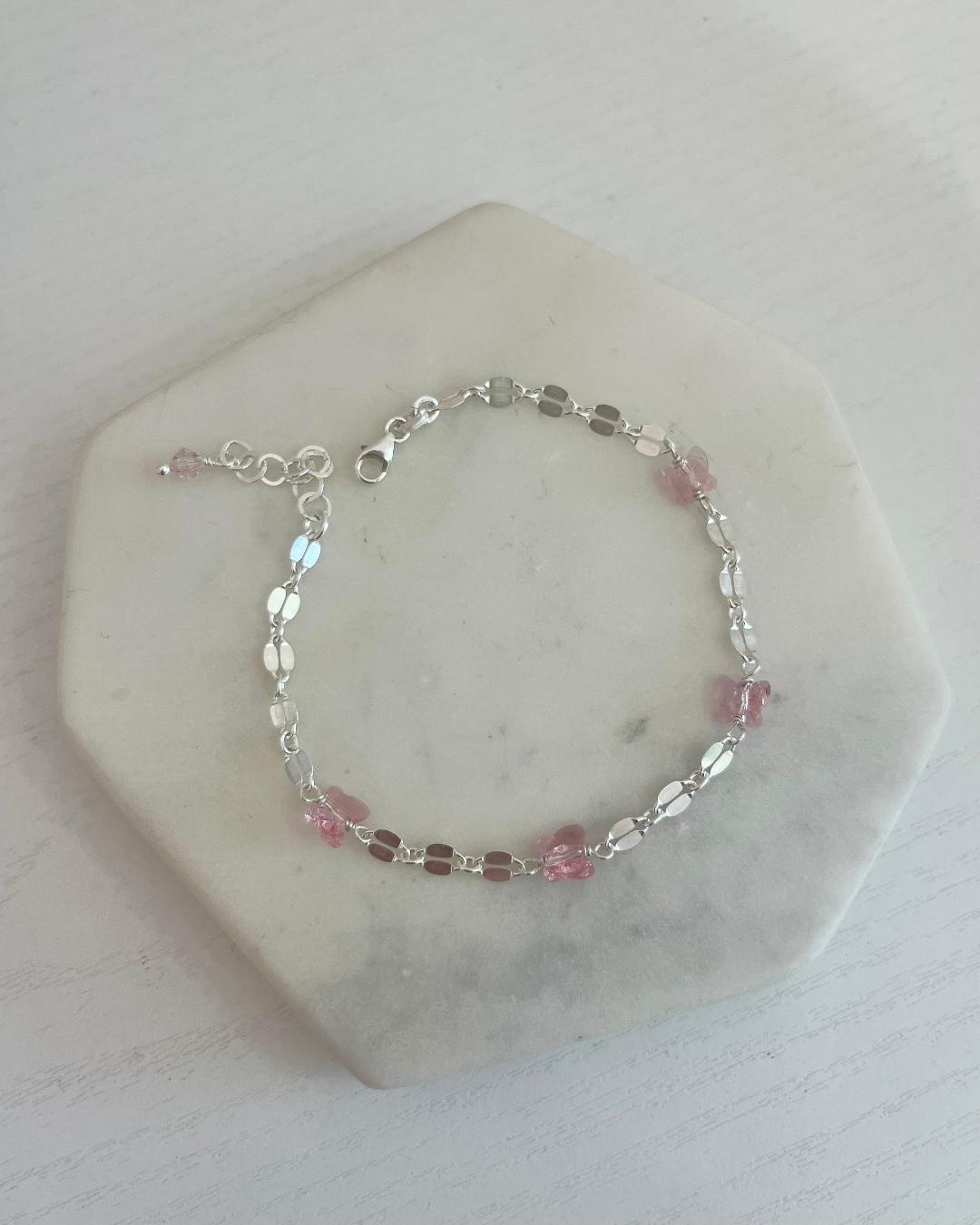 Ένα βραχιόλι πλεγμένο στο χέρι με ροζ, φουξ ή λιλά κρυστάλλινες πεταλούδες.