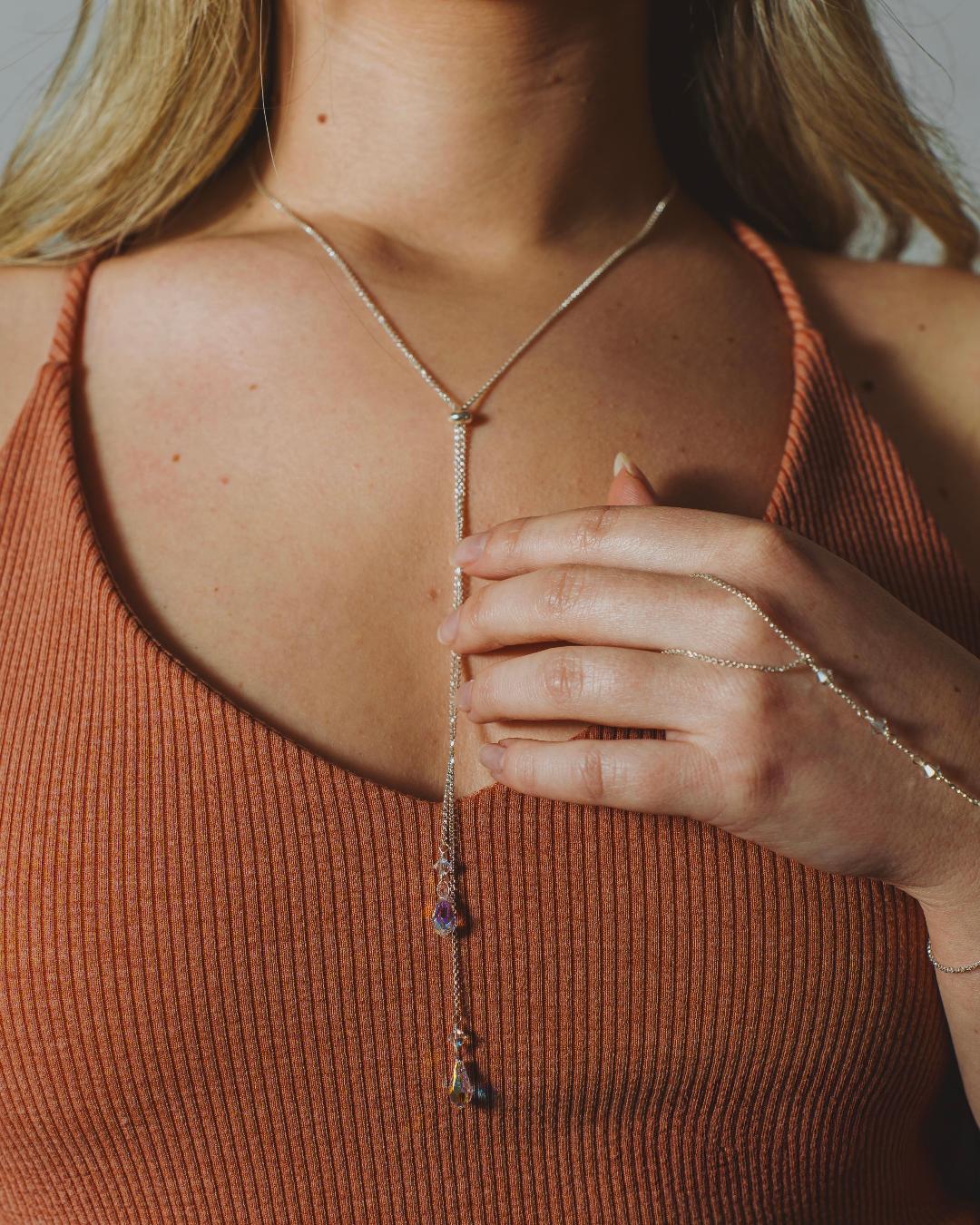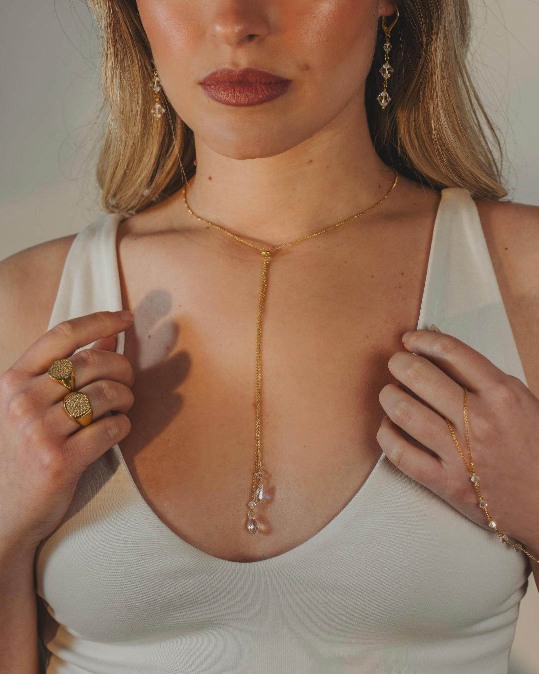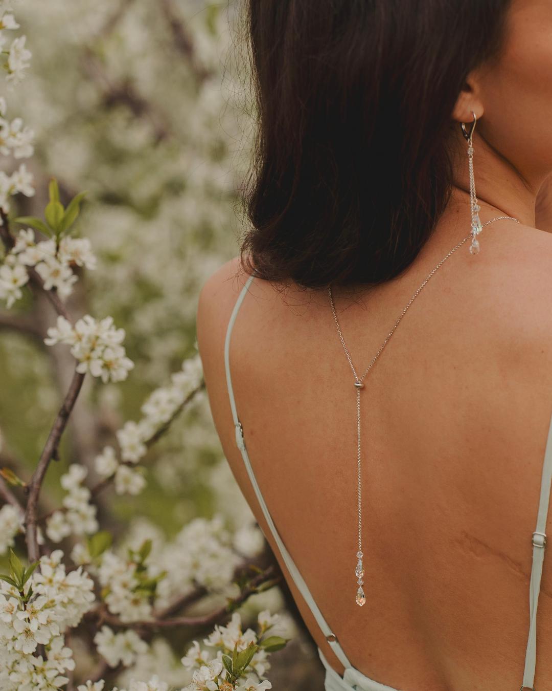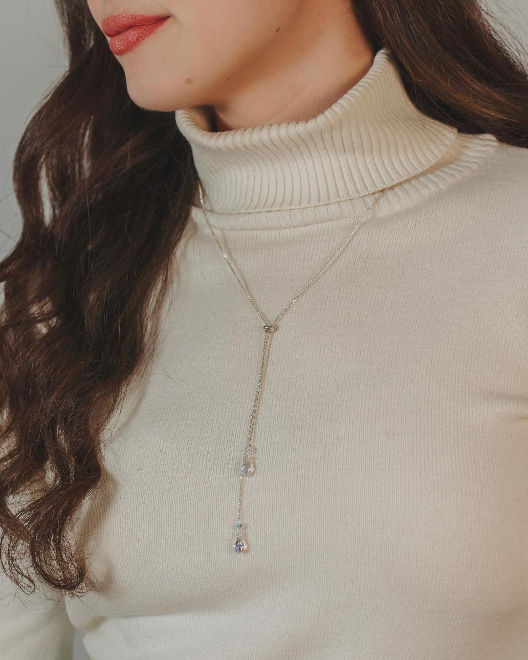Είμαι σίγουρη ότι θα λατρέψεις αυτήν την πολυμορφική γραβάτα. Η μπίλια προσαρμόζεται στο ύψος της γραβάτας που εσύ επιθυμείς. Στο τελείωμα της θα βρεις λευκά κρυστάλλινα δάκρυα που θα δώσουν αυτήν την υπέροχη λάμψη στο κόσμημα. Το πιο μοναδικό; Μπορείς να την φορέσεις και στην πλάτη με ένα εξώπλατο φόρεμα ή τοπ. Θα απογειωθεί!