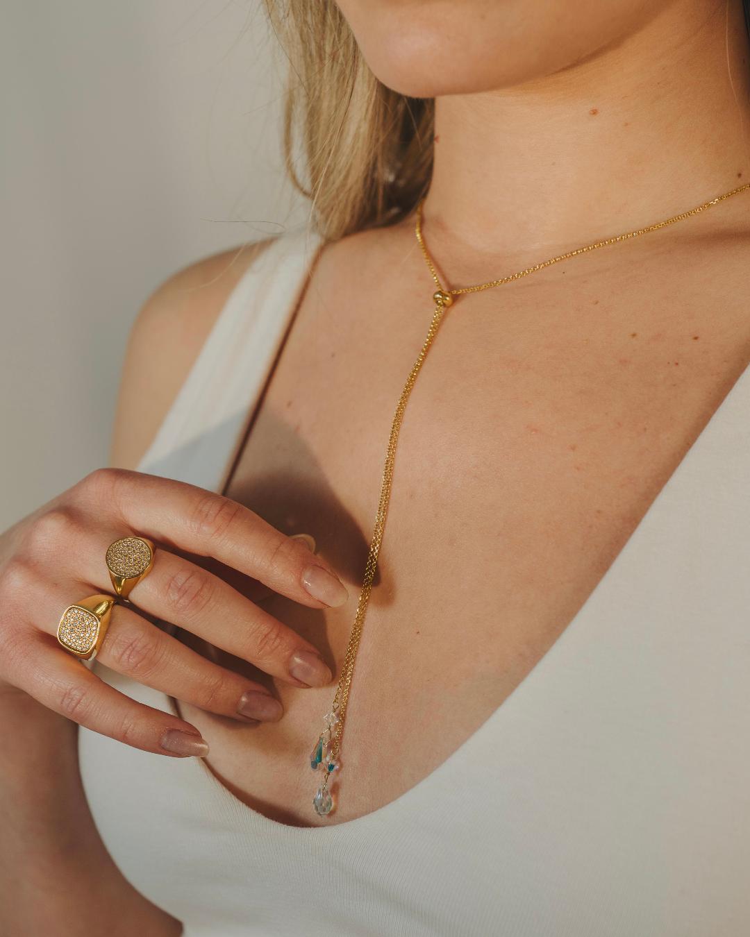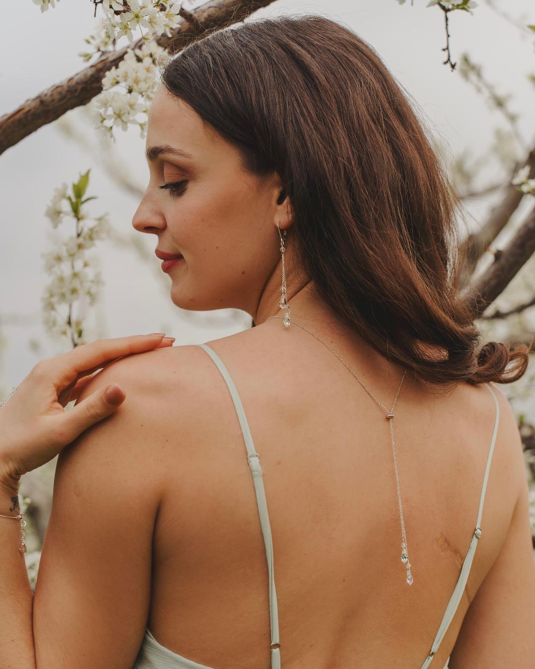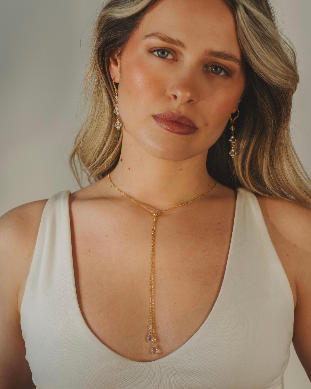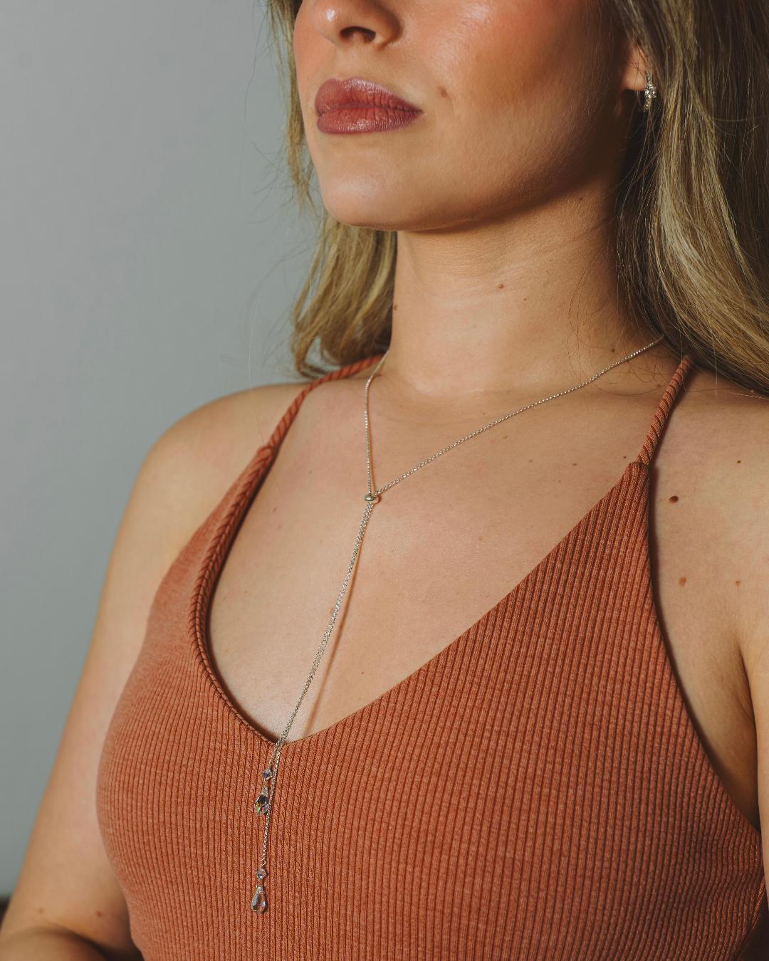 Είμαι σίγουρη ότι θα λατρέψεις αυτήν την πολυμορφική γραβάτα. Η μπίλια προσαρμόζεται στο ύψος της γραβάτας που εσύ επιθυμείς. Στο τελείωμα της θα βρεις λευκά κρυστάλλινα δάκρυα που θα δώσουν αυτήν την υπέροχη λάμψη στο κόσμημα. Το πιο μοναδικό; Μπορείς να την φορέσεις και στην πλάτη με ένα εξώπλατο φόρεμα ή τοπ. Θα απογειωθεί!